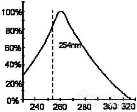 如圖所示,從圖中可以看出遺傳物質(zhì)核酸DNA和RNA對(duì)紫外線吸收光譜的范圍為250-280nm,傳統(tǒng)低壓汞燈的發(fā)光譜線主要有254nm和185nm兩條,因此當(dāng)UVLED燈波長(zhǎng)為254nm時(shí),核酸對(duì)紫外線有最大吸收,即殺菌效果最好。
